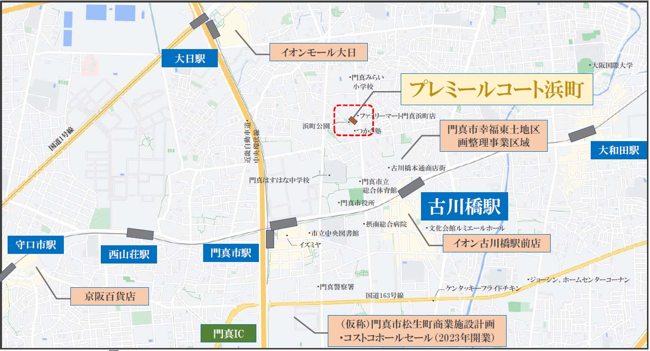 徒歩圏内にイオンモール大日。京阪「古川橋」駅前には「イオン古川橋駅前店」が徒歩7分など、商業施設が充実しています。また、2023年春開業予定の「ららぽーと」や「コストコ」も近くにあります。